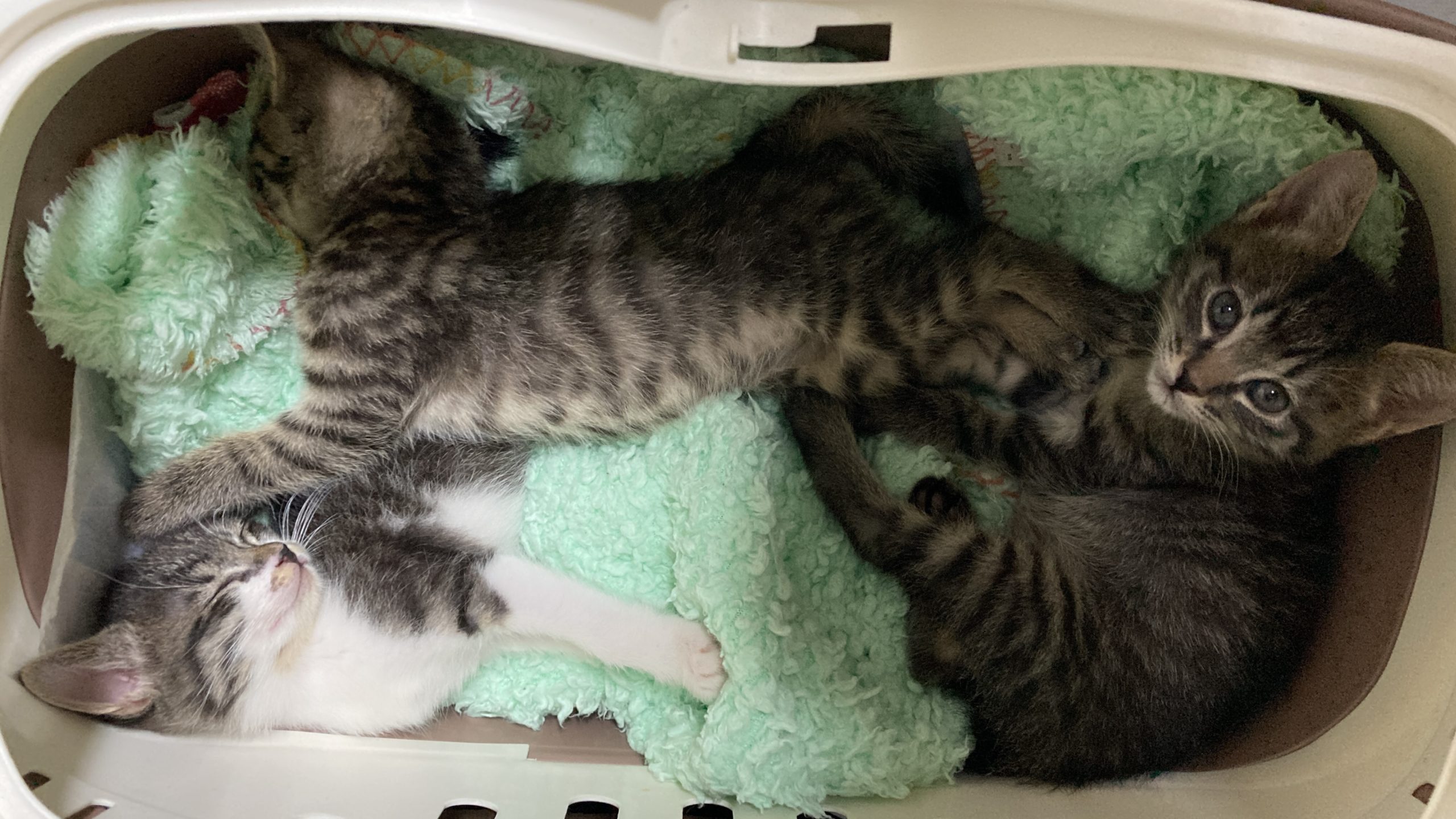 子猫の頃、キャリーの中でいつも使っていたブランケット。もーちゃん(右)